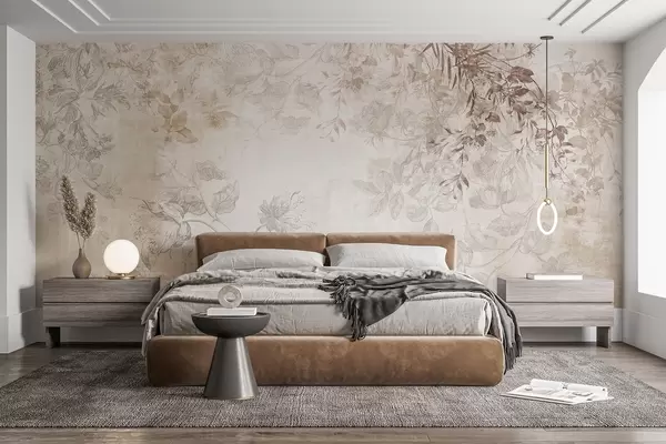 Vintage textured floral art with drawing style delicate garden flowers and leaves illustrations, soft pastel beige and sepia tones - Wall mural (No. w09402)