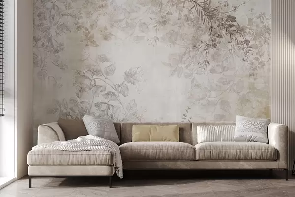 Vintage textured floral art with drawing style delicate garden flowers and leaves illustrations, soft pastel beige and sepia tones - Wall mural (No. w09402)