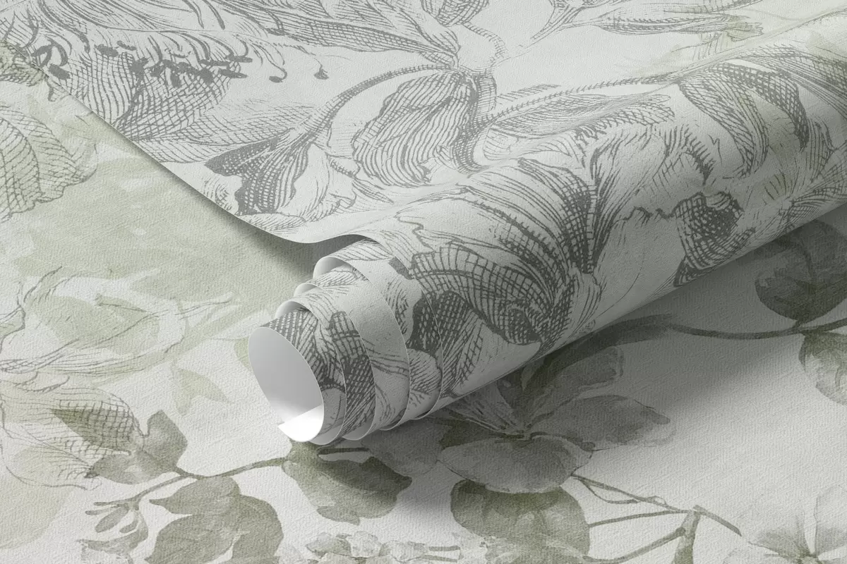 Vintage textured floral art with drawing style delicate garden flowers and leaves illustrations, soft green tones - Wall mural (No. w09402v2)