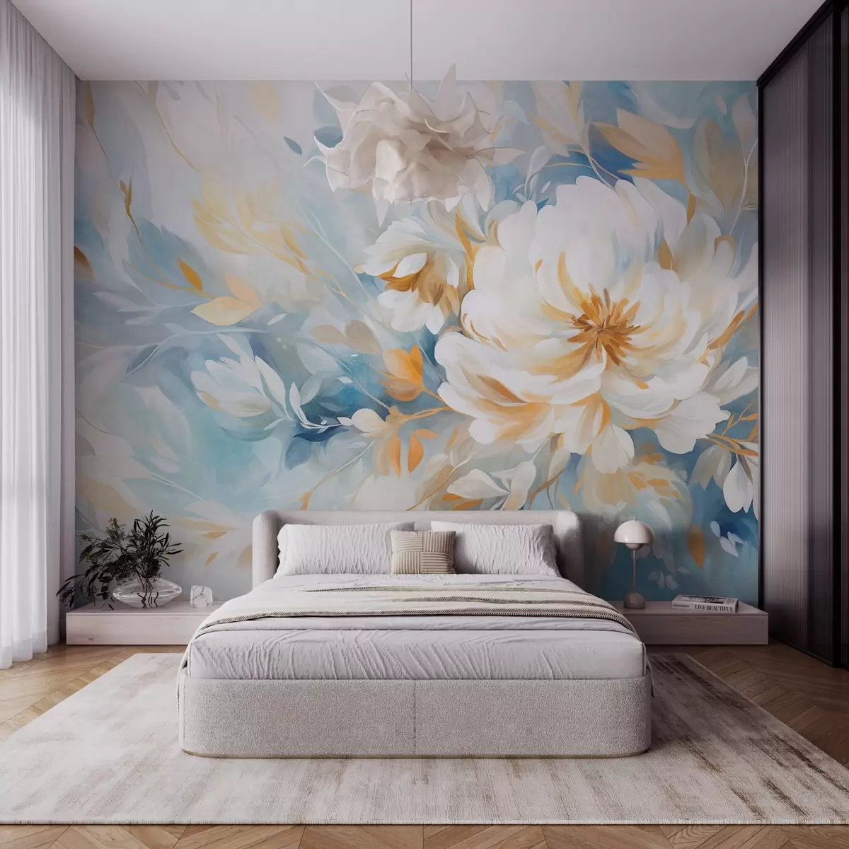 Textured white flower with blue and yellow details and leaves on a blue and white abstract background, painting style - Wall mural (No. w09403)