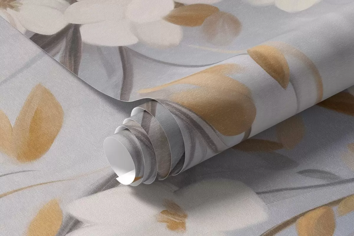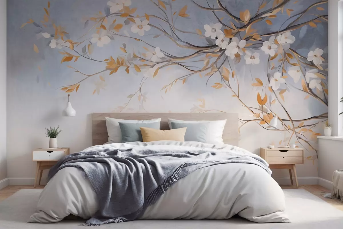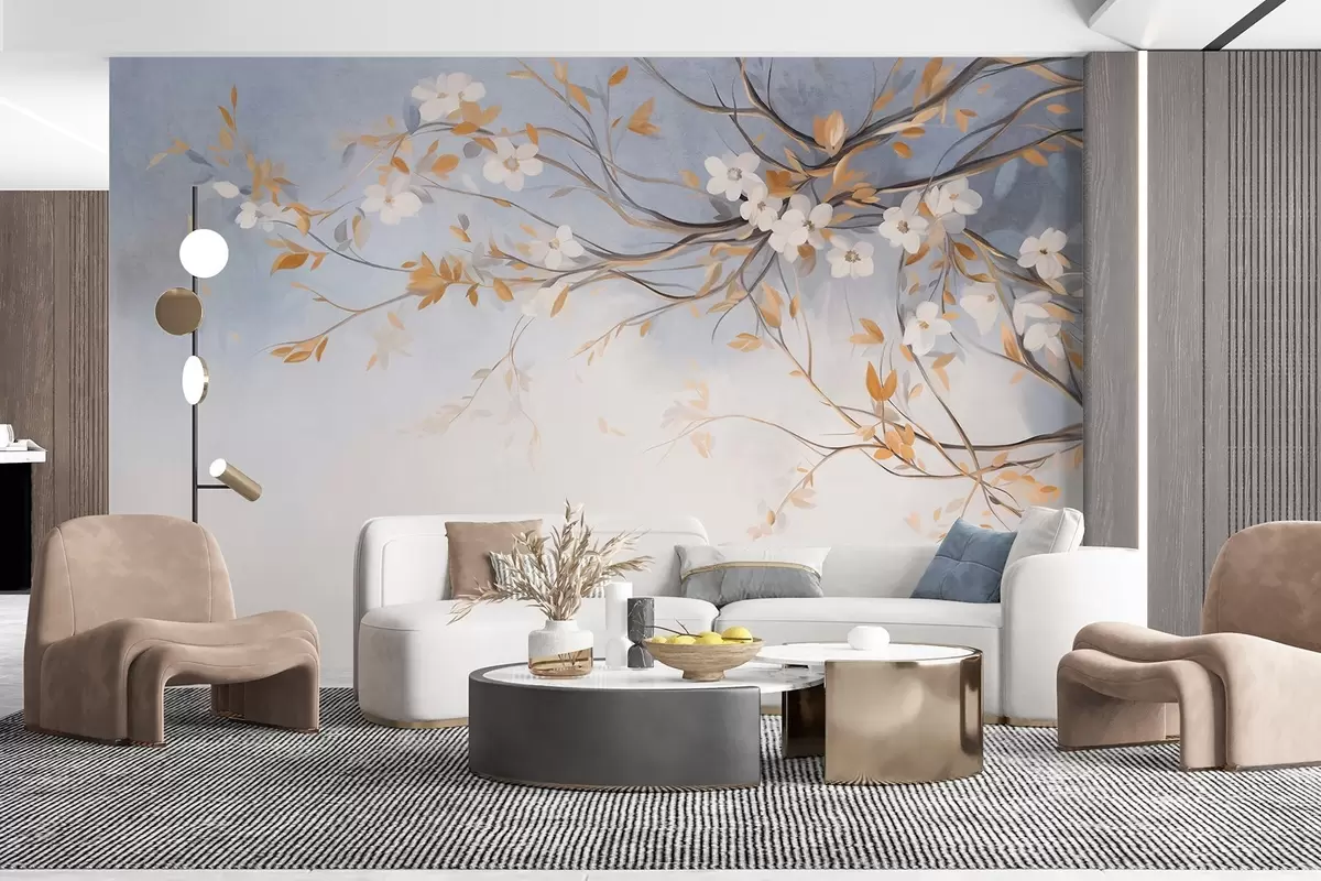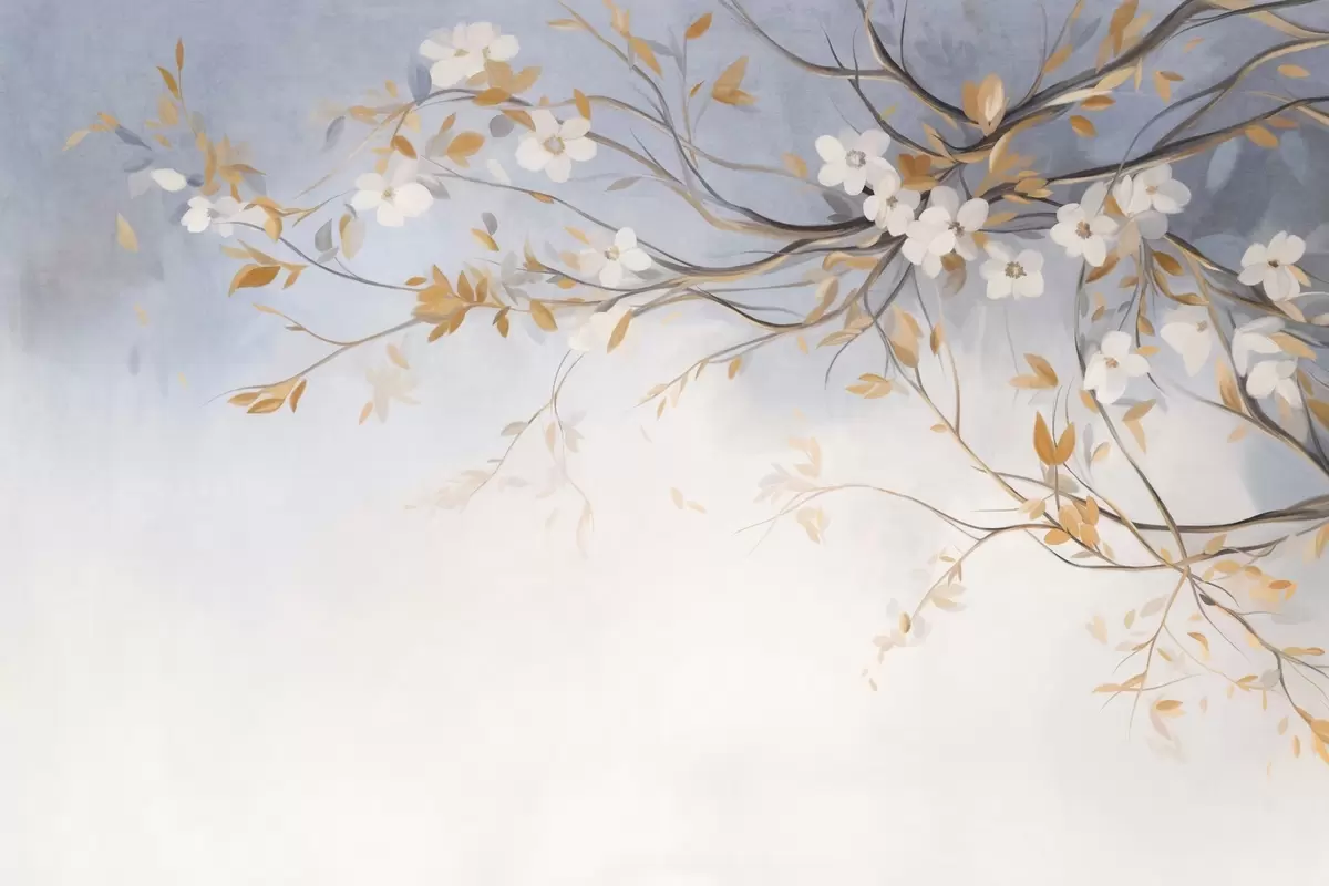 White flowers with orange leaves on a tree branch, light blue textured background, delicate brushstrokes - Wall mural (No. w09415)