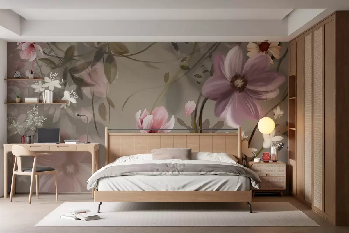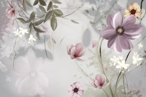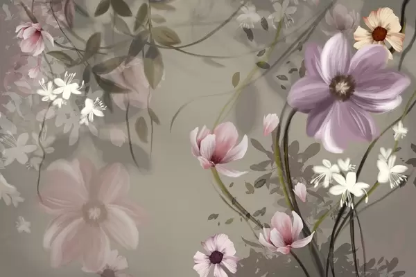 Pink and white flowers with brown stems and leaves, soft lighting, muted colors, floral arrangement - Wall mural (No. w09417)