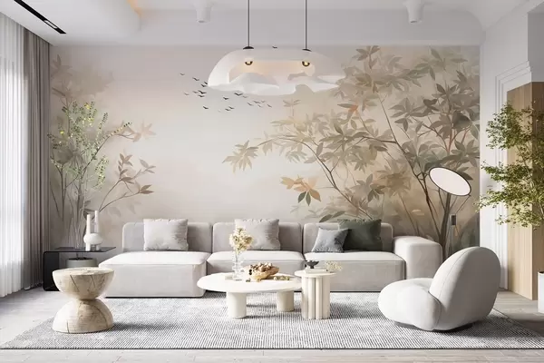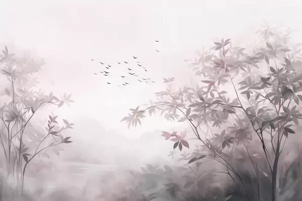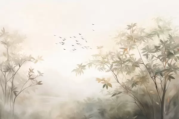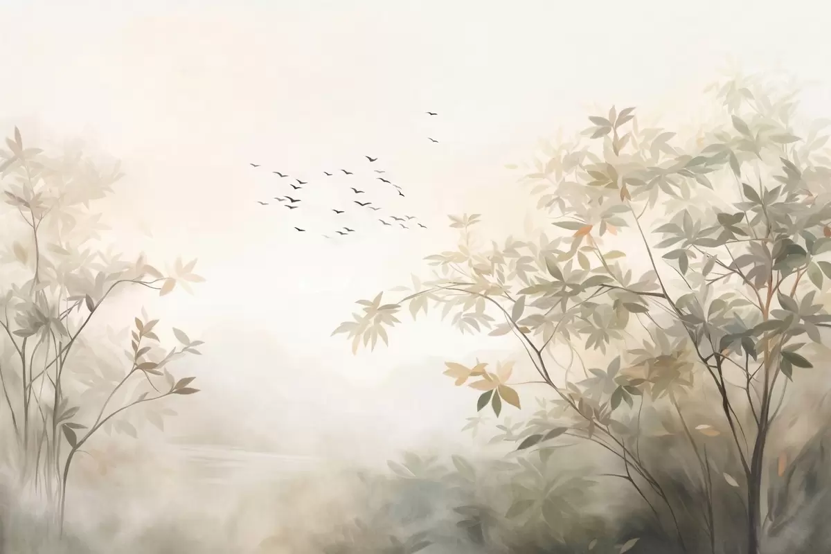 Textured landscape with trees and a flock of birds flying in the sky, pastel colors, nature scene - Wall mural (No. w09418)