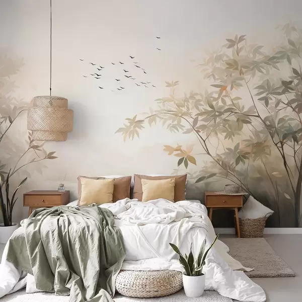 Textured landscape with trees and a flock of birds flying in the sky, pastel colors, nature scene - Wall mural (No. w09418)