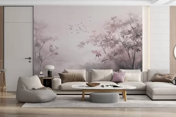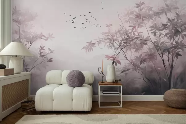 Textured landscape with trees and a flock of birds flying in the sky, pastel colors, nature scene - Wall mural (No. w09418v1)