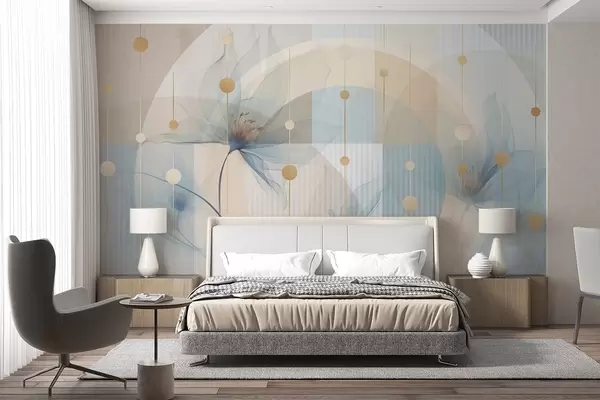 Abstract translucent flowers, circles and geometric shapes, pastel blue, beige and white color palette - Wall mural (No. w09419)