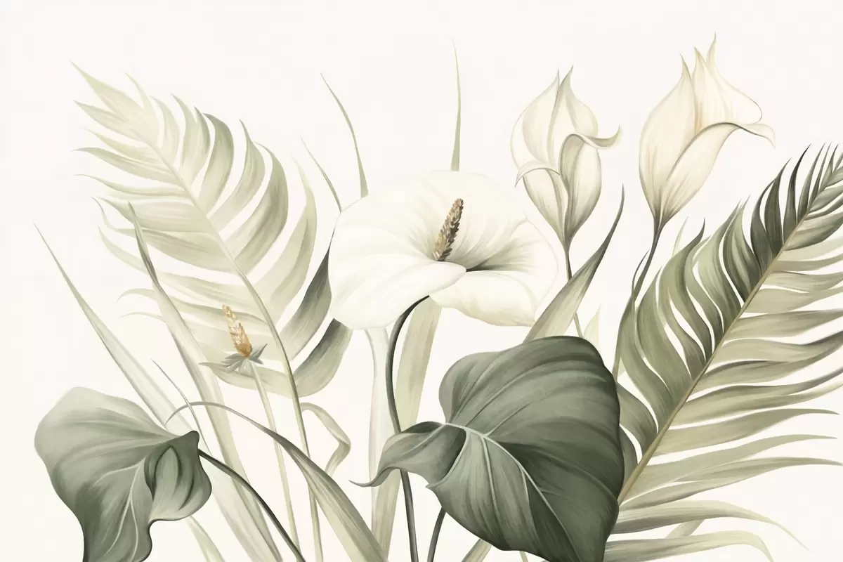 White calla lilies and green tropical leaves, botanical illustration, light background, vintage style, textured - Wall mural (No. w09423)