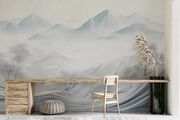 Snowy abstract decorative mountain landscape with white trees and fog, minimalist textured style - Wall mural (No. w09426)