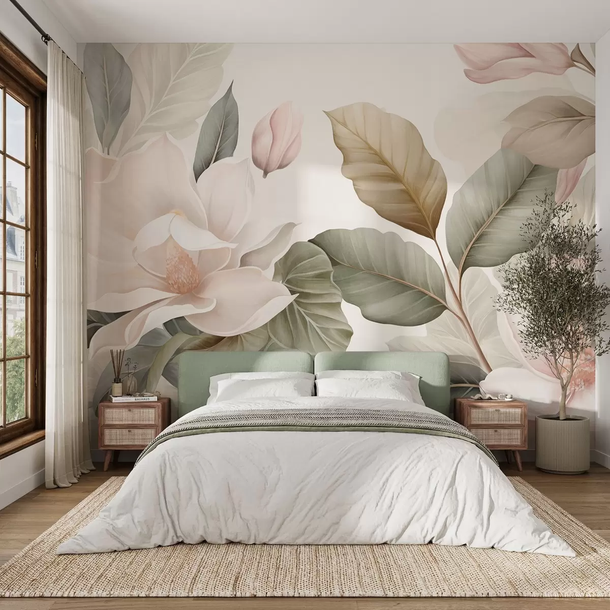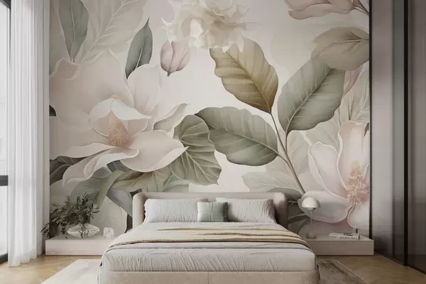 Magnolia flowers with leaves in pastel colors, white, pink and green, soft, delicate, watercolor style - Wall mural (No. w09427)