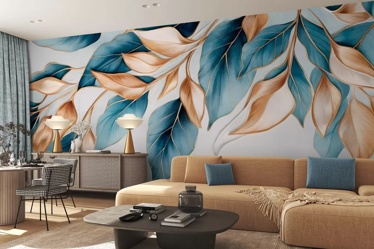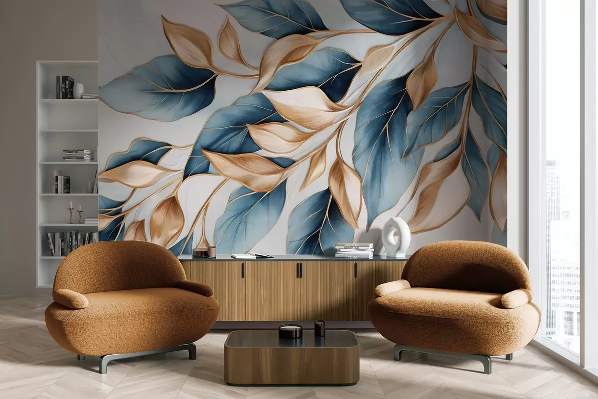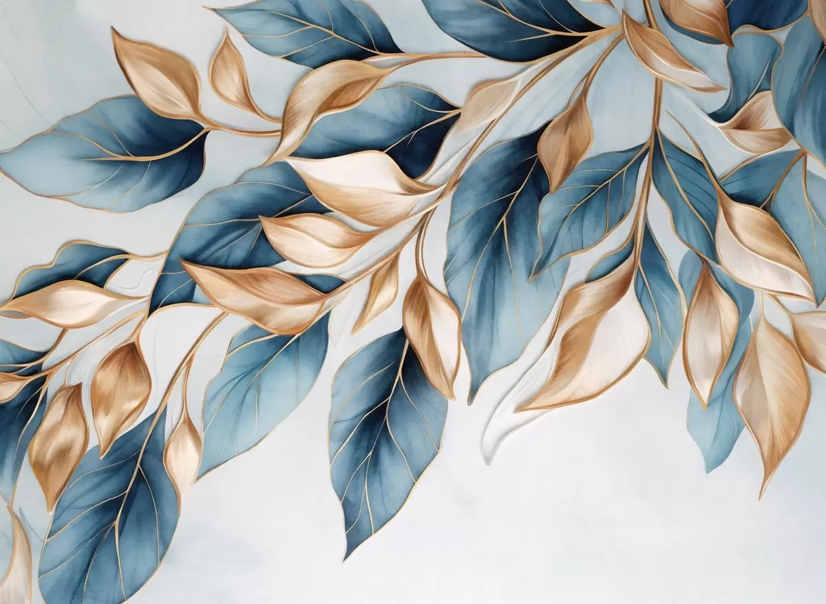 Textured blue and orange leaves, light blue background, elegant and artistic manner design, modern style - Wall mural (No. w09429)