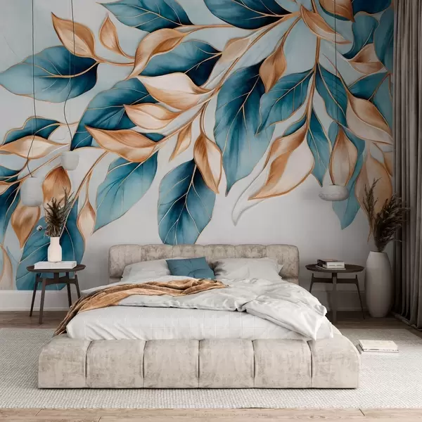 Textured blue and orange leaves, light blue background, elegant and artistic manner design, modern style - Wall mural (No. w09429)