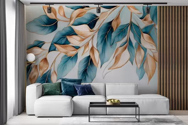 Textured blue and orange leaves, light blue background, elegant and artistic manner design, modern style - Wall mural (No. w09429)