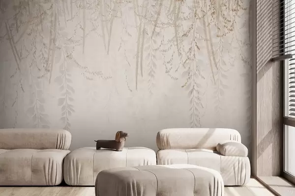 Light hanging leaves and branches in beige tones - Wall mural (No. w09433)