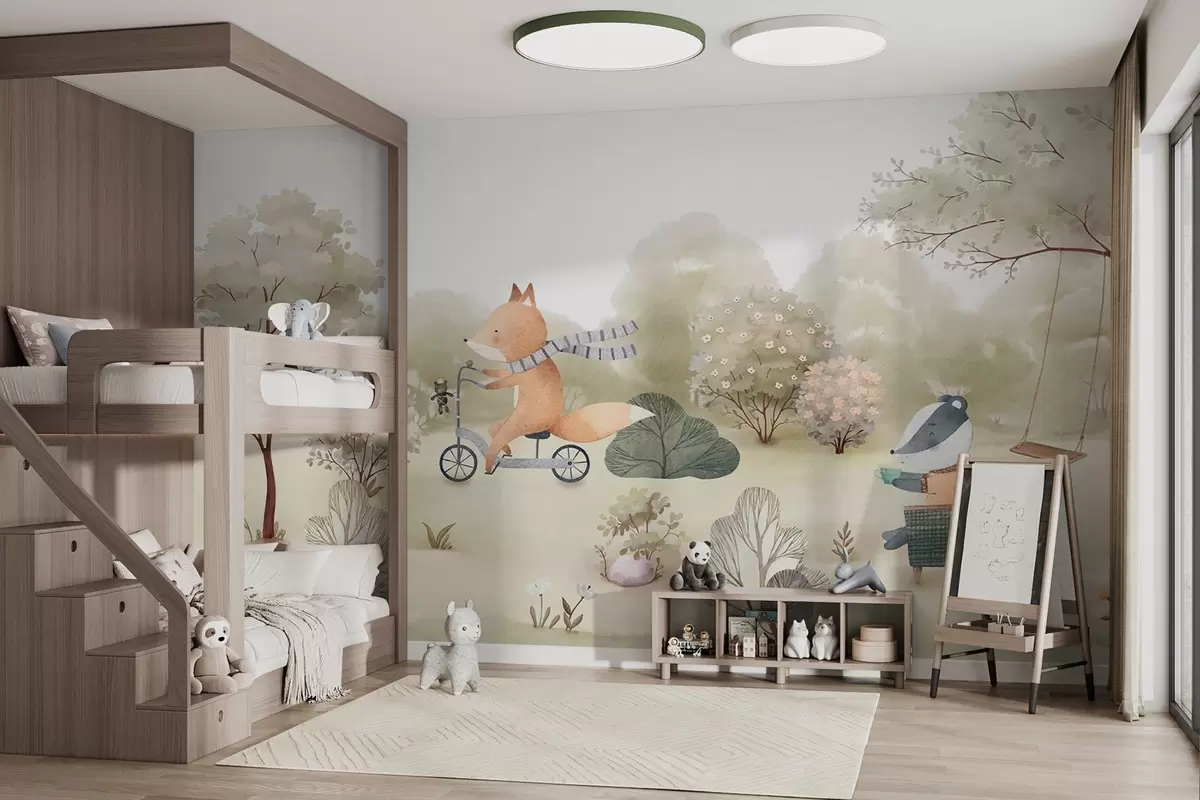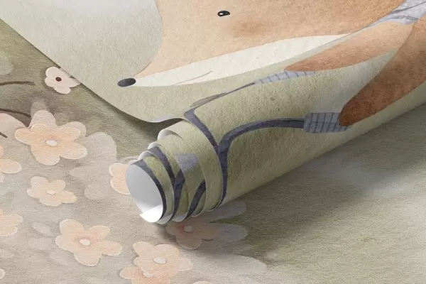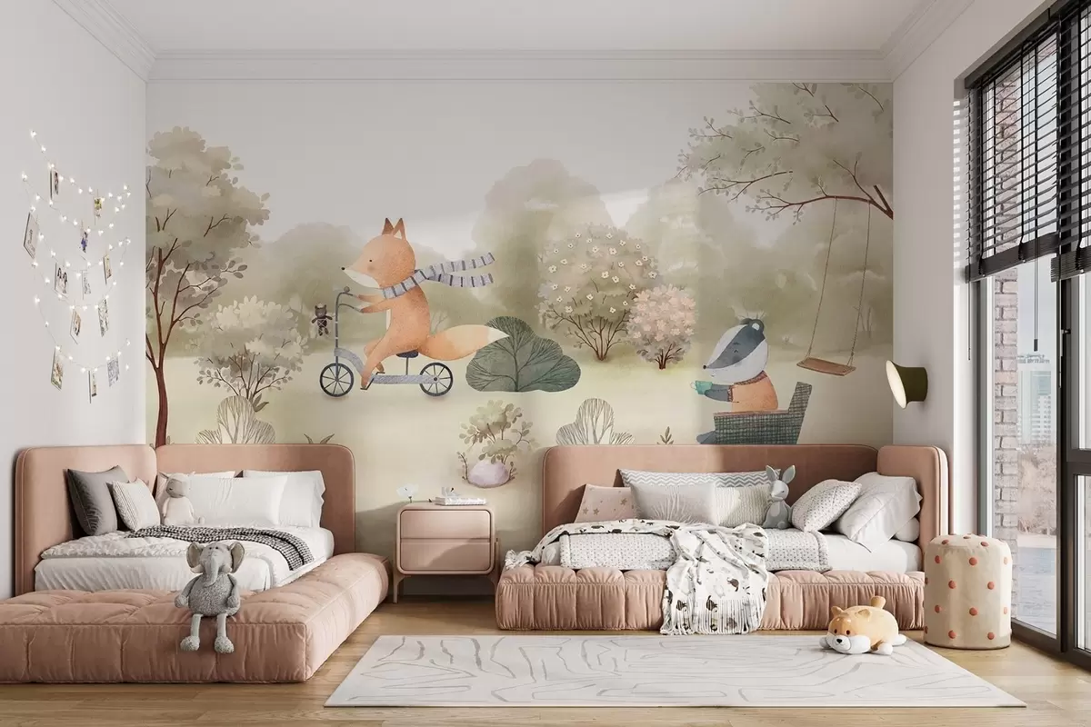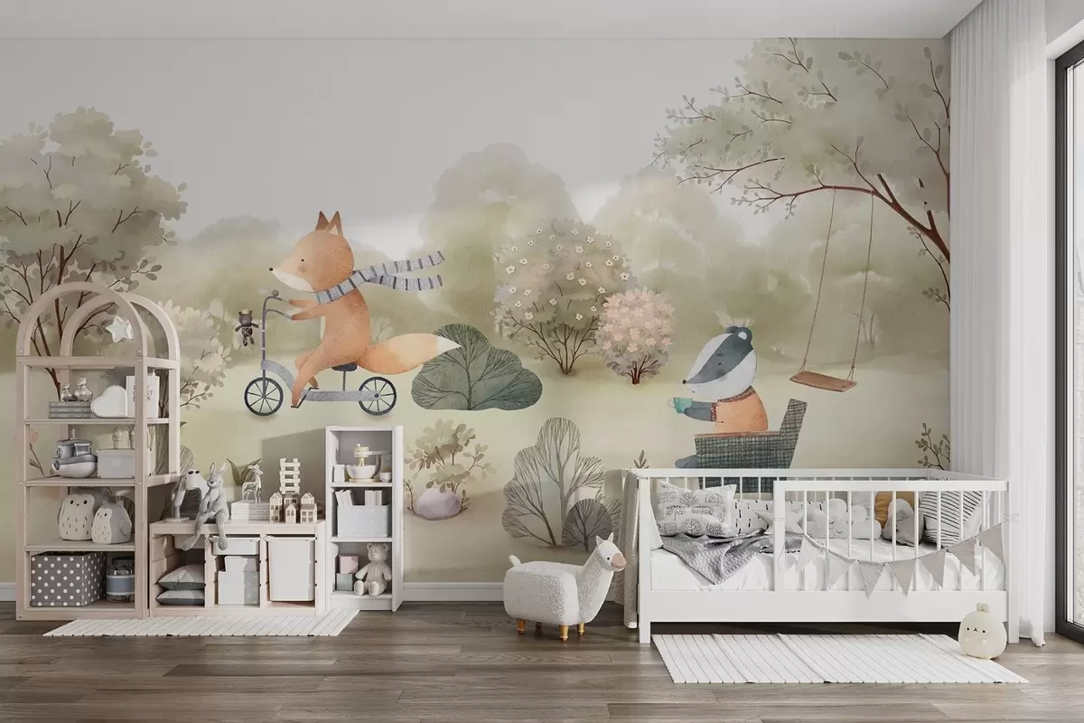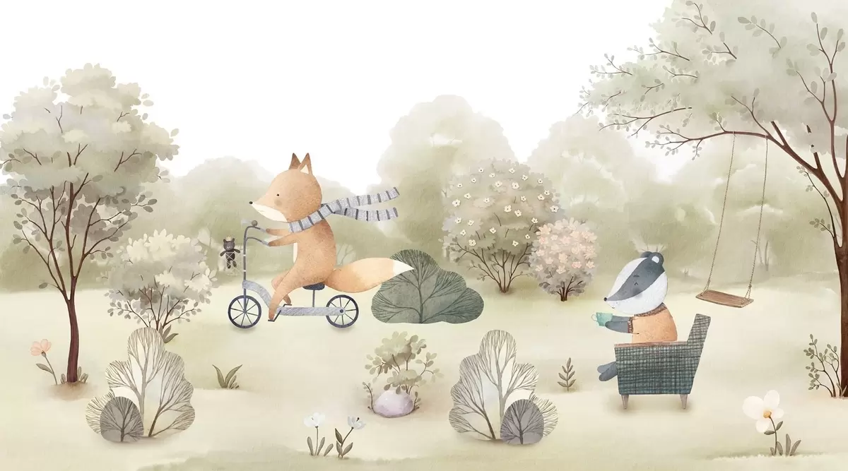 Fox on a bicycle and badger with tea, forest animals in watercolor style - Wall mural (No. w09439)