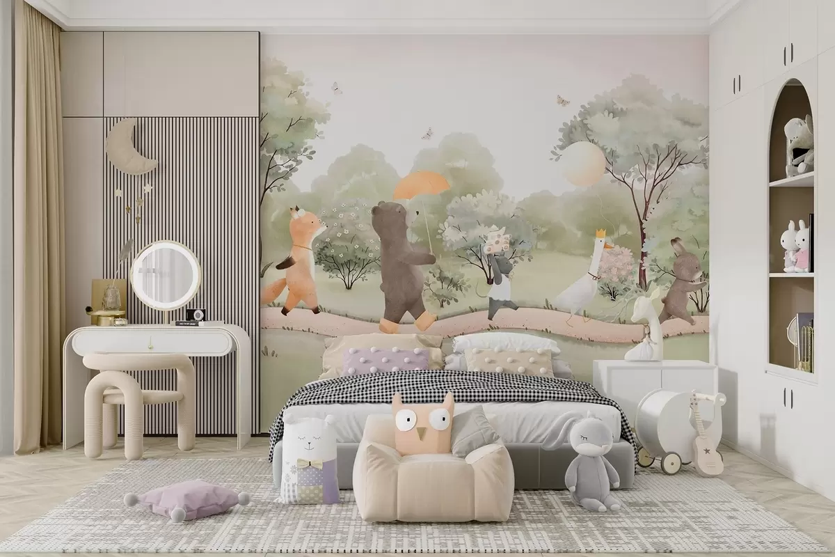 Festive journey of little animals through the forest in watercolor style - Wall mural (No. w09440)