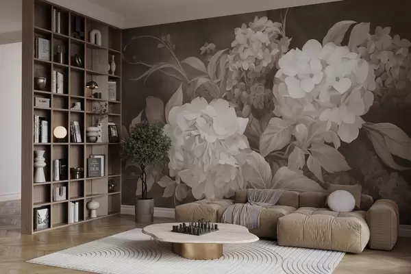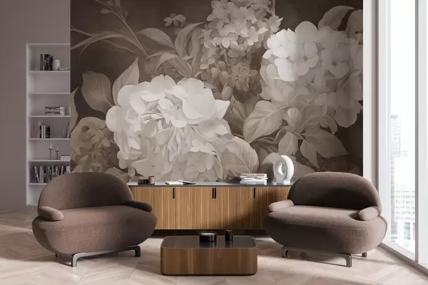 Textured sepia painting imitation of hydrangeas flowers with big leaves, abstract and dark background - Wall mural (No. w09465)
