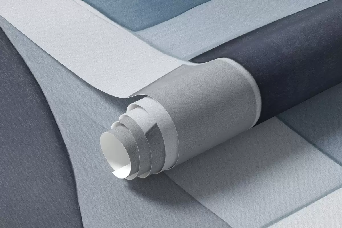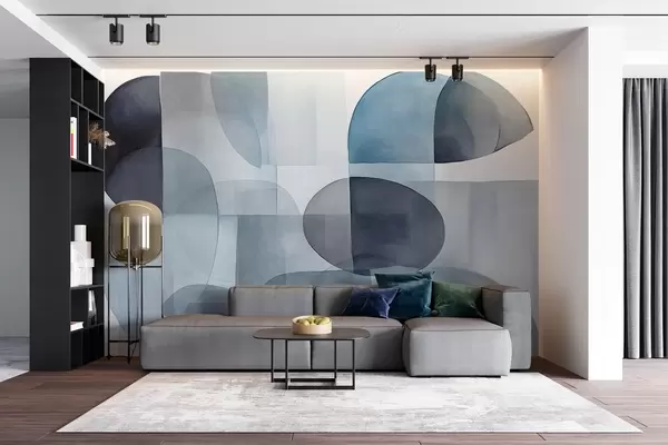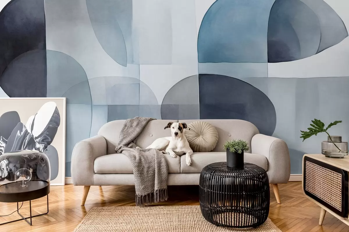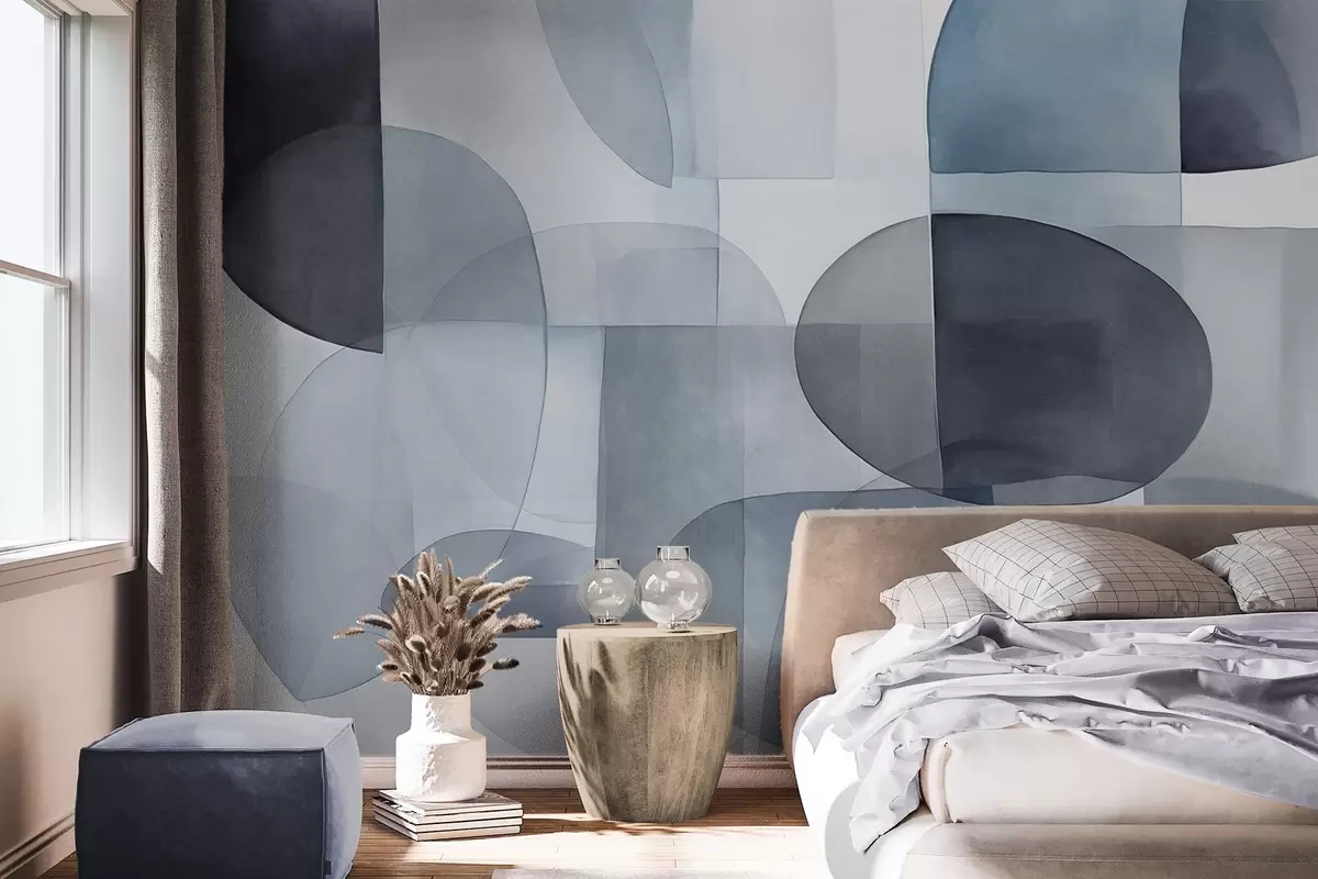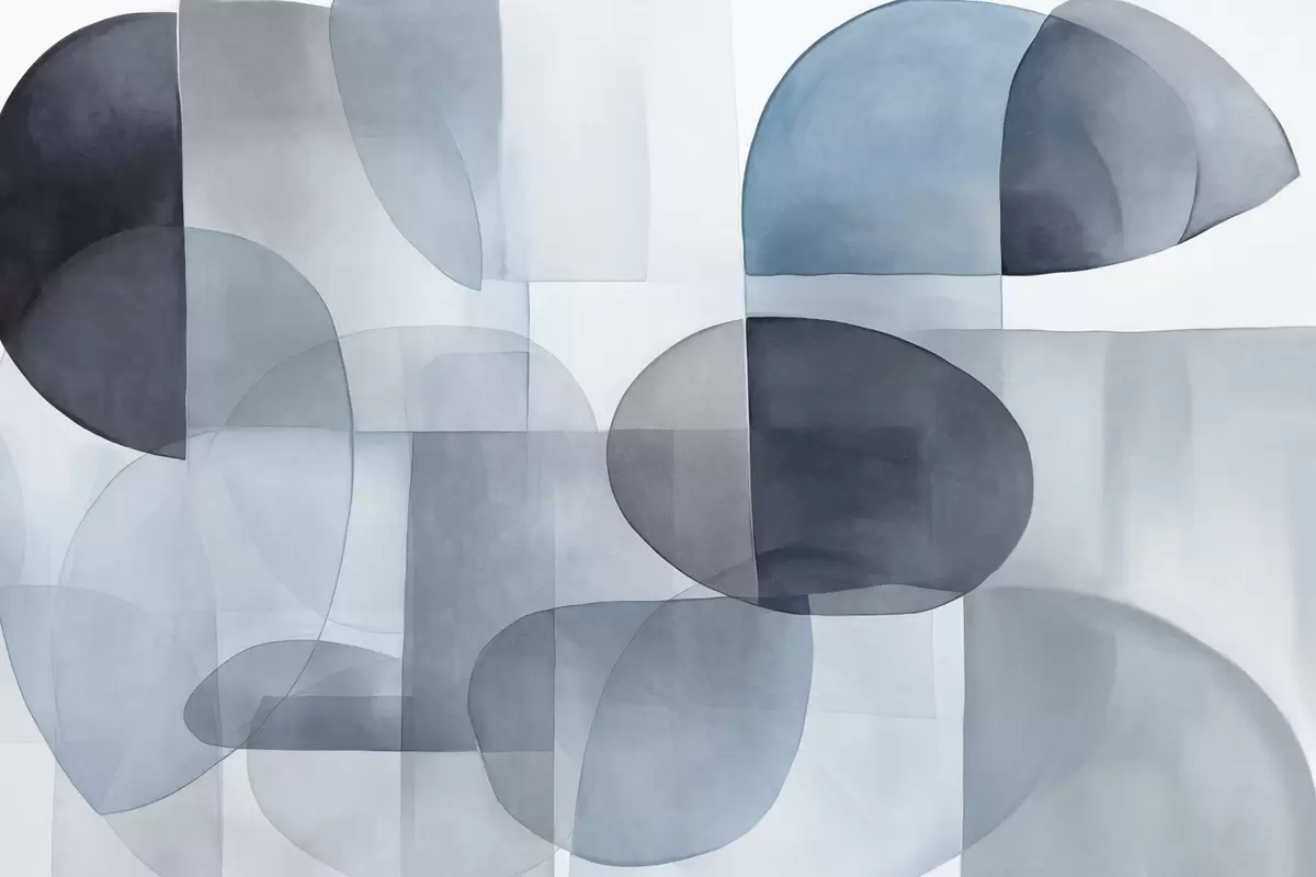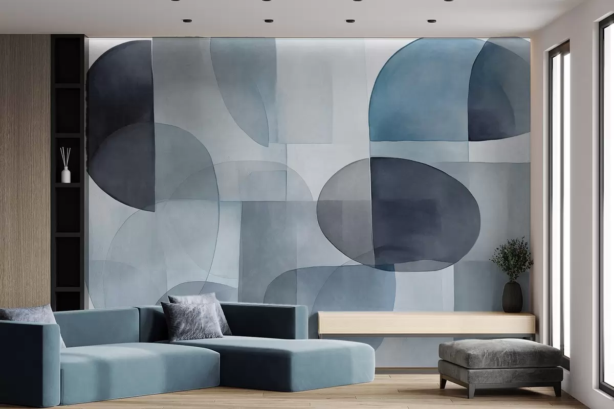 Abstract textured shapes in shades of gray and blue, muted tones, minimalist composition, neutral background - Wall mural (No. w09467v1)