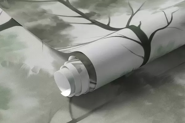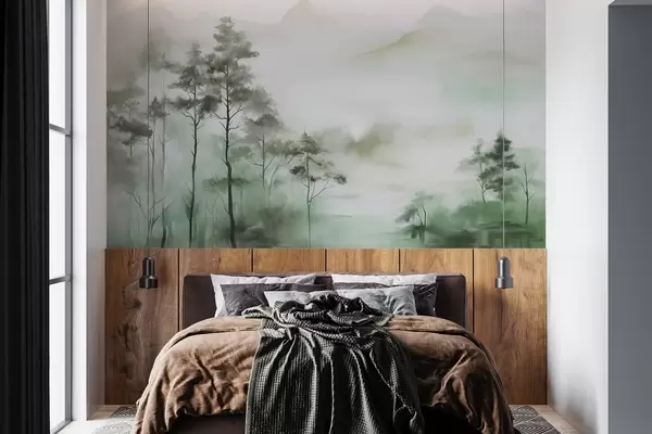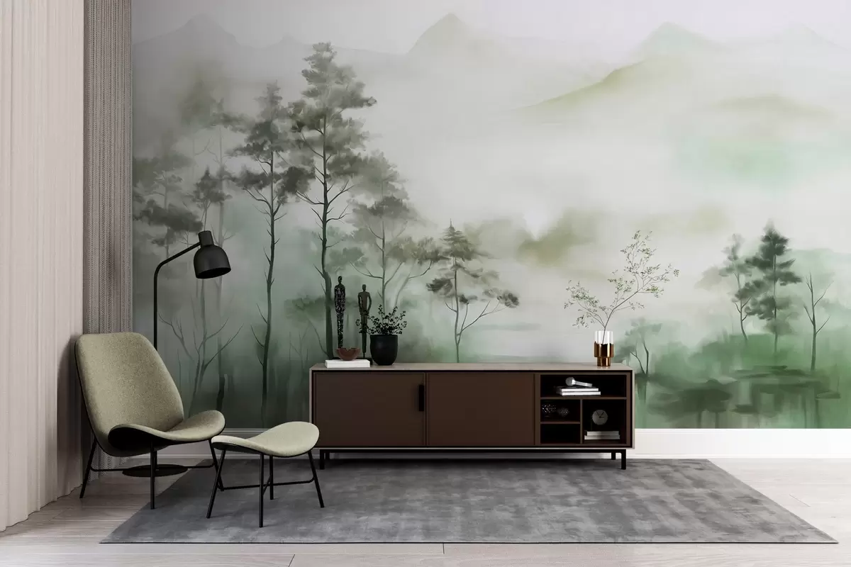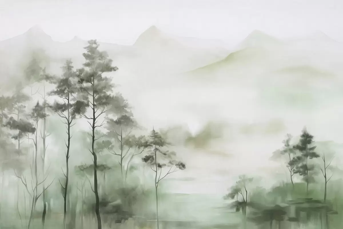 Foggy landscape with tall trees and mountains muted green and gray tones, minimalist style, textured - Wall mural (No. w09469)