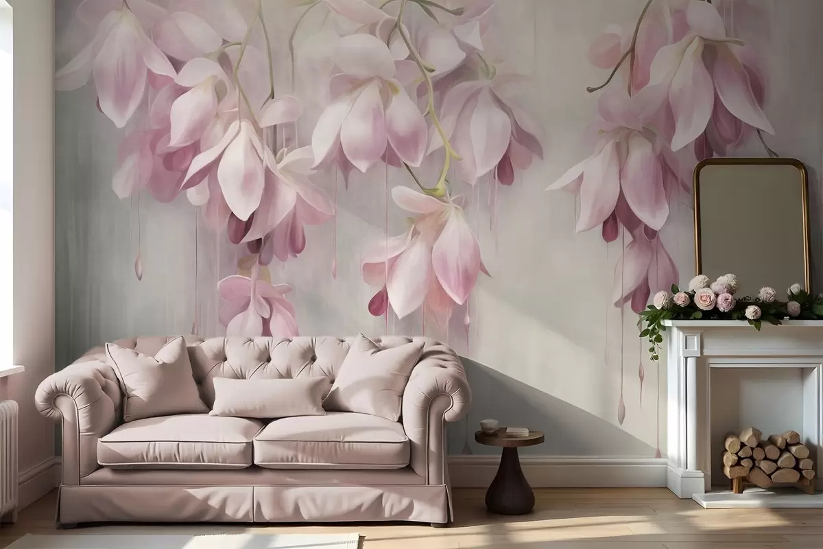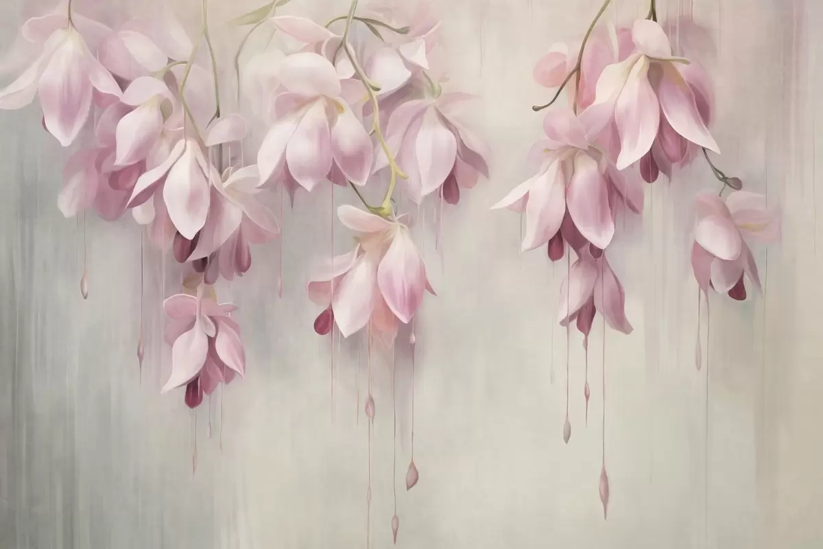 Hanging pink flowers, light gray background, floral textured arrangement, botanical art, pastel colors - Wall mural (No. w09471)