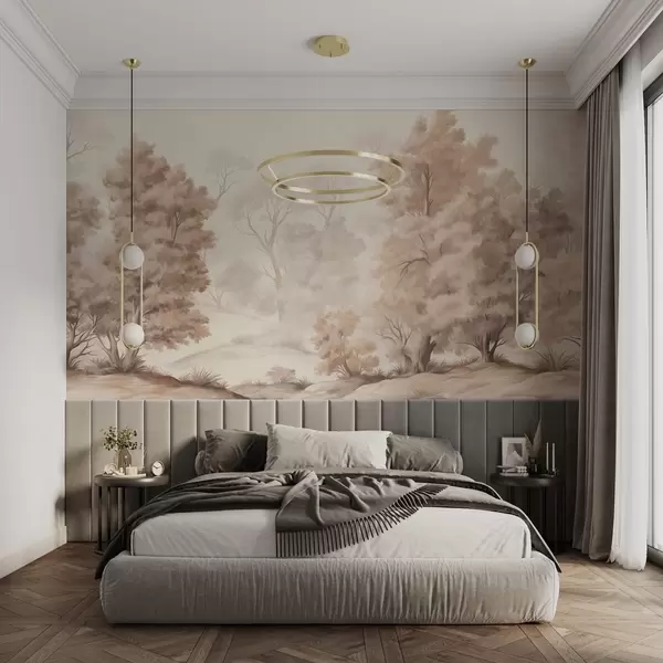 Textured landscape painting imitation of a forest with tall trees and grass, muted and soft colors, calming scene - Wall mural (No. w09474)