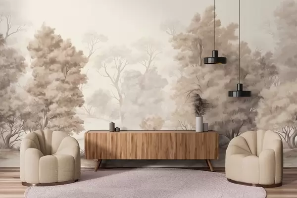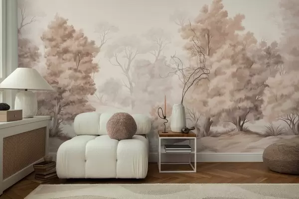 Textured landscape painting imitation of a forest with tall trees and grass, muted and soft colors, calming scene - Wall mural (No. w09474)