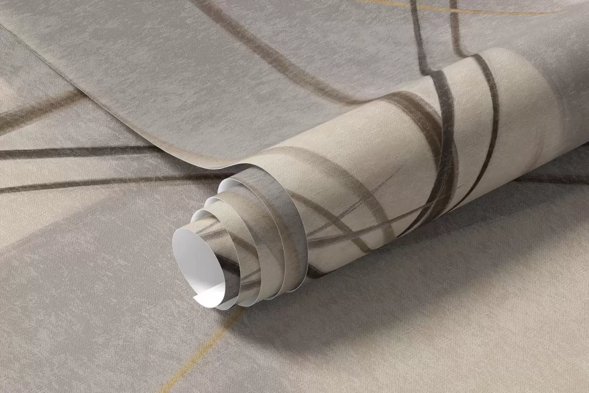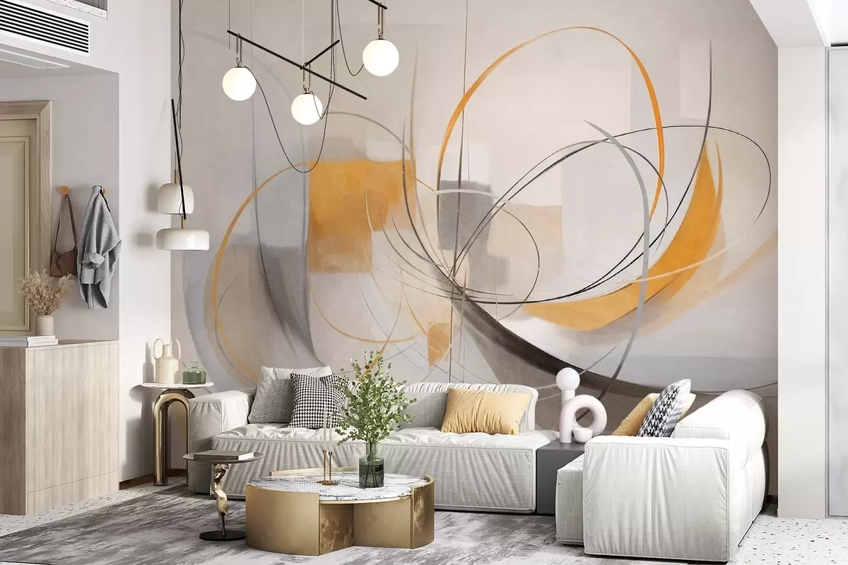 Abstract textured modern painting style with curved lines and geometric shapes in shades of gray, white and orange - Wall mural (No. w09476)