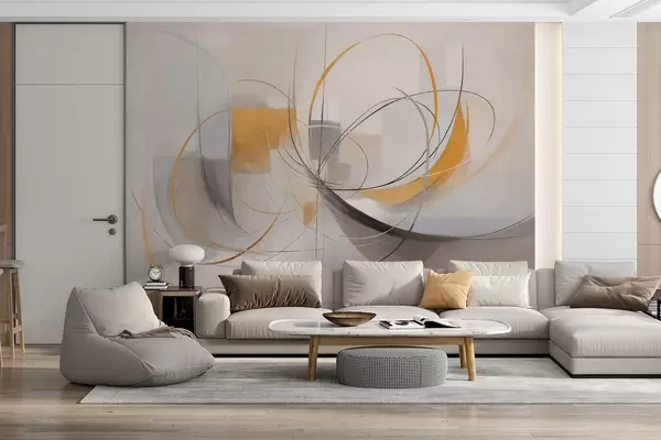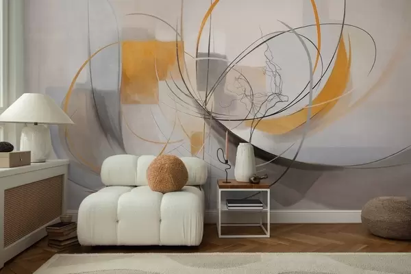 Abstract textured modern painting style with curved lines and geometric shapes in shades of gray, white and orange - Wall mural (No. w09476)