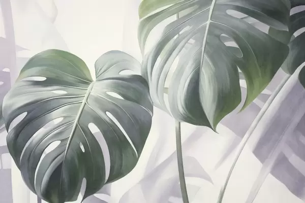 Textured monstera leaves large and green, against a soft, light abstract background - Wall mural (No. w09477)