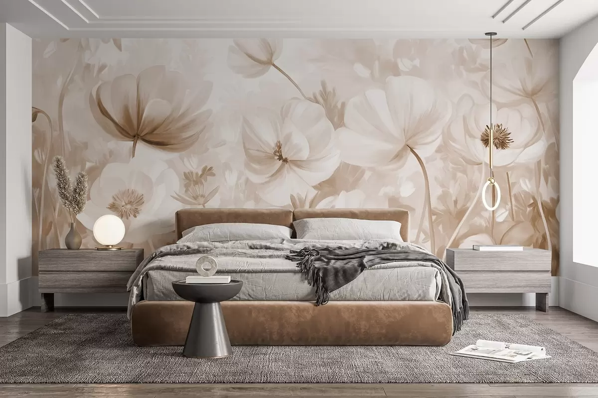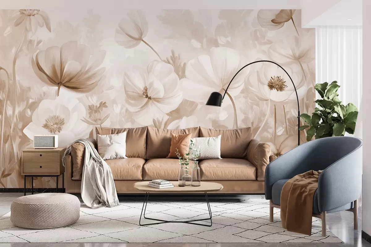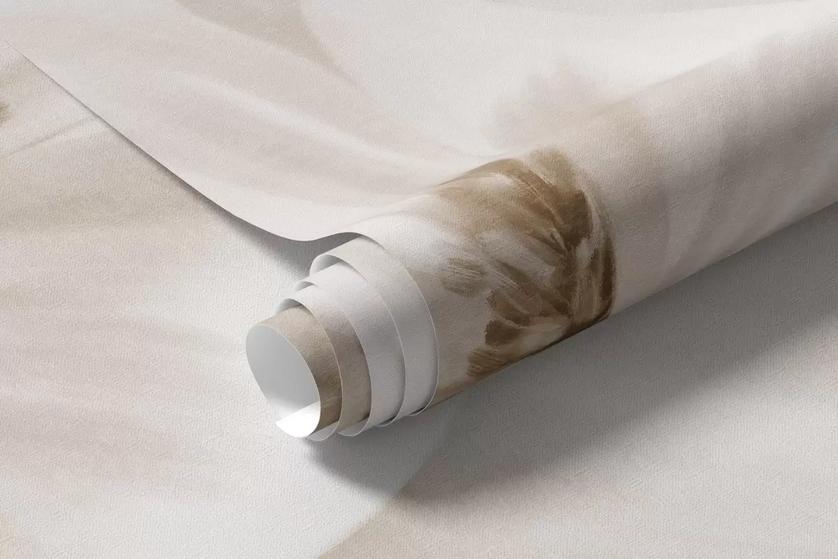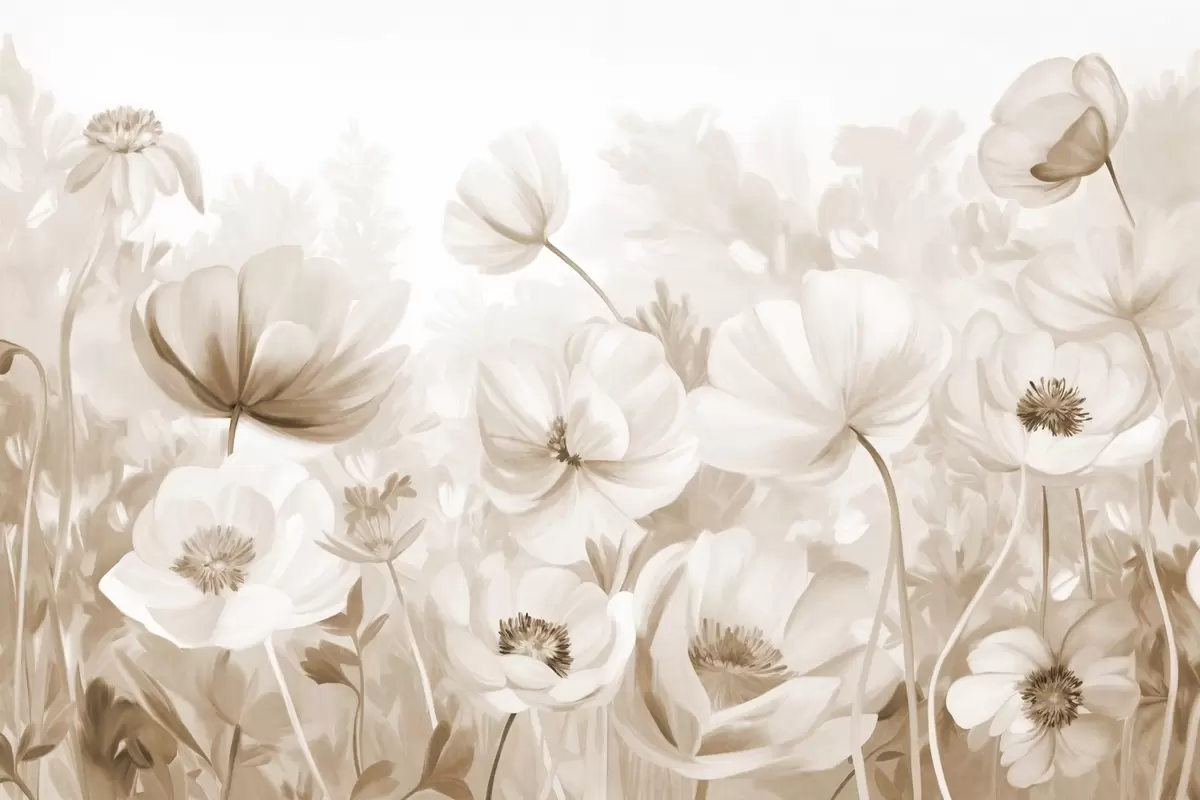 A field of beige flowers with delicate petals, soft brown leaves, in a dreamy, textured watercolor style - Wall mural (No. w09481v1)