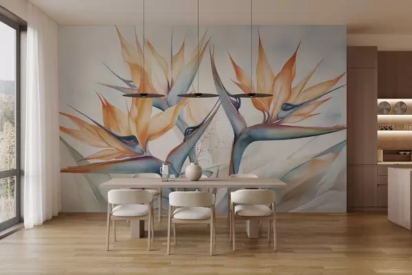 Bird of paradise flower, strelitzia with orange petals, soft watercolor textured style, light background - Wall mural (No. w09483)