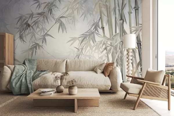 Textured bamboo stems and leaves in a soft, muted color palette of gray, white and cream, minimalist composition - Wall mural (No. w09485)