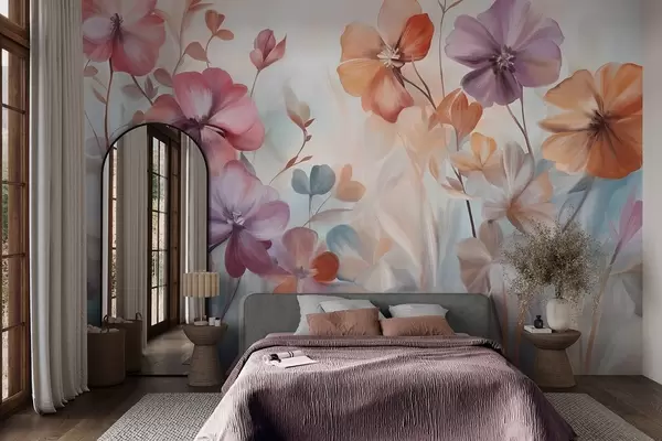 Textural floral arrangement with pink, purple and orange flowers with green stems and leaves, soft pastel colors - Wall mural (No. w09486)
