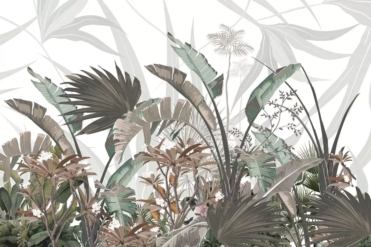 Tropical textured leaves with flowers, palm trees , plumeria flowers, pastel colors, white background, jungle - Wall mural (No. w09488)