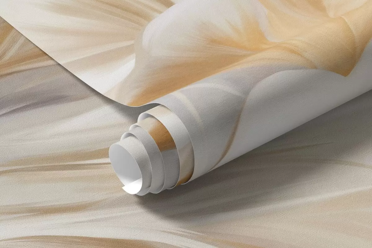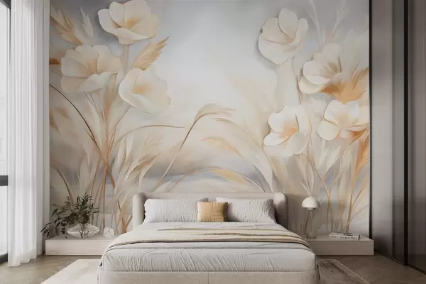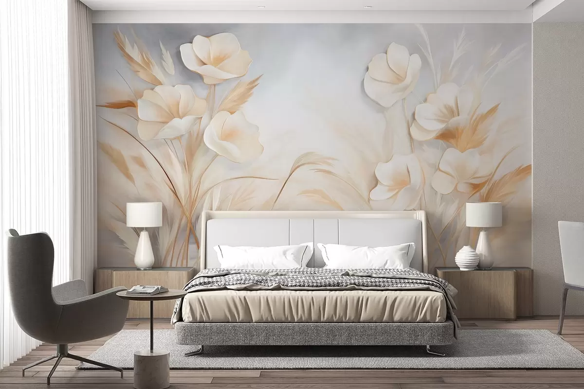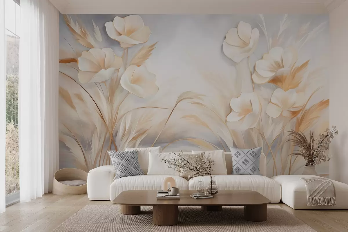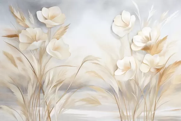 White flowers, beige reeds and pampas grass, textured, elegant, minimalist style, landscape abstract background - Wall mural (No. w09490)