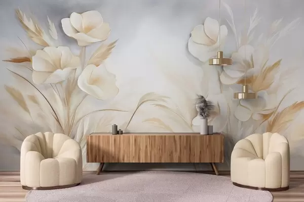 White flowers, beige reeds and pampas grass, textured, elegant, minimalist style, landscape abstract background - Wall mural (No. w09490)