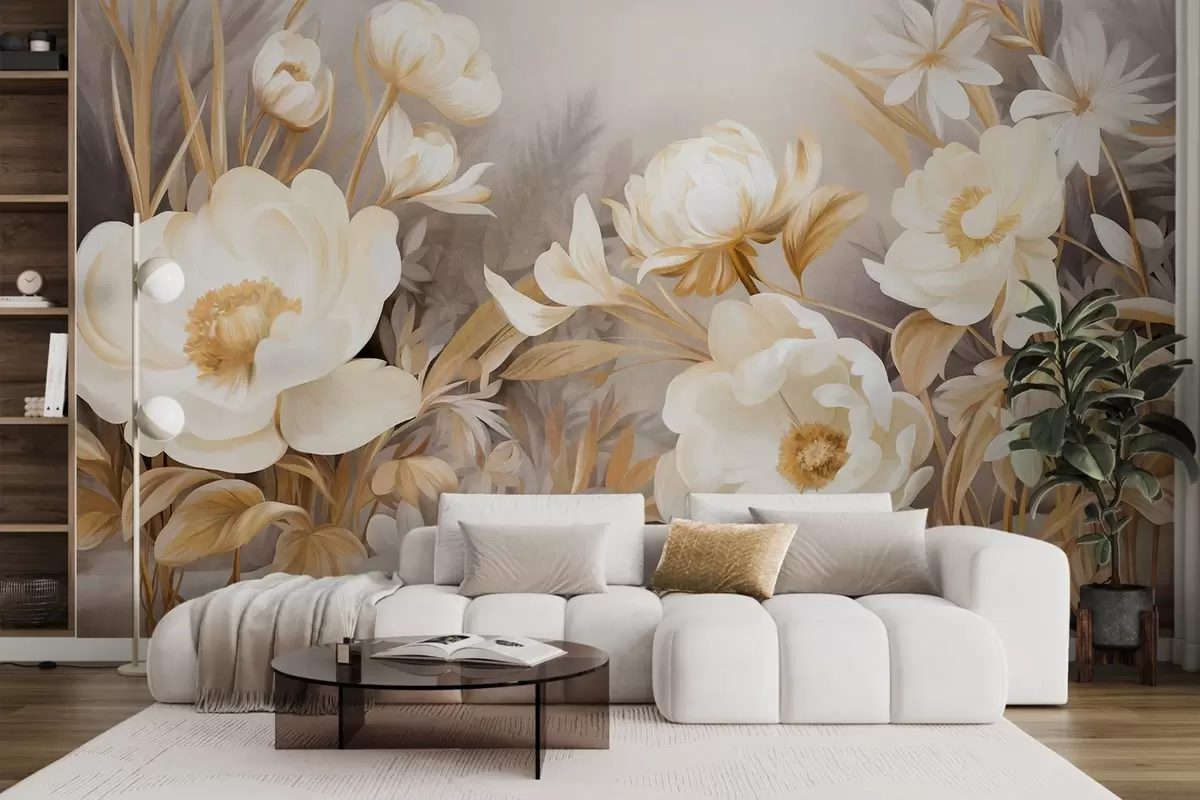 White and yellow peonies and other flowers with tall grass and leaves in a soft, painterly textured style - Wall mural (No. w09494)