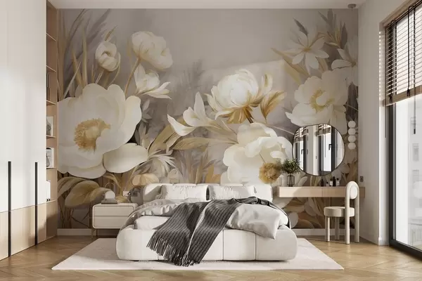 White and yellow peonies and other flowers with tall grass and leaves in a soft, painterly textured style - Wall mural (No. w09494)