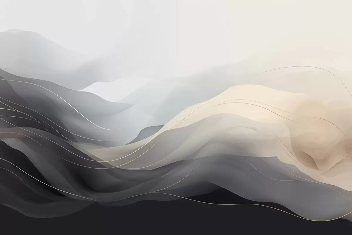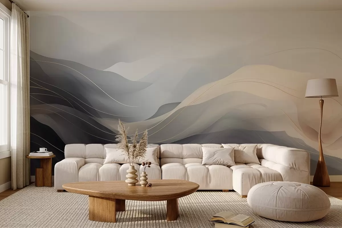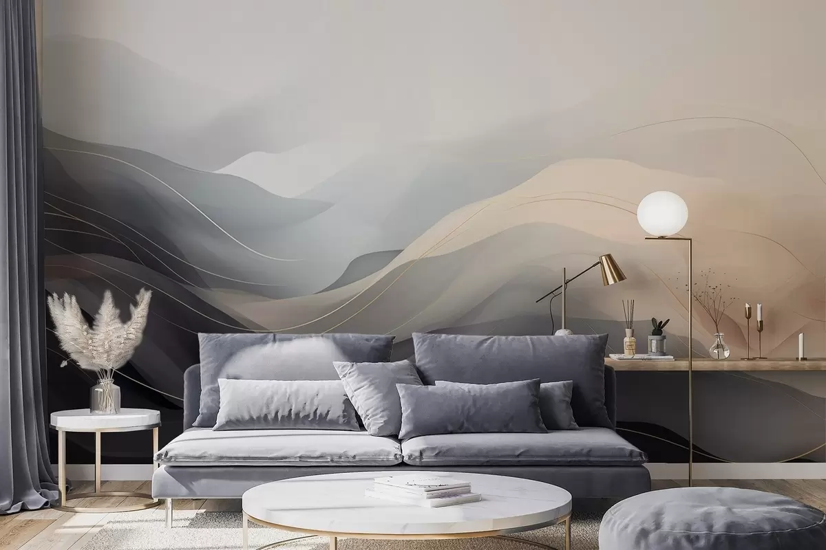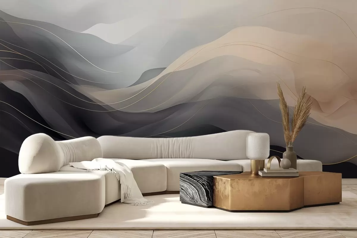 Abstract misty waves in gray-cream tones with yellow lines - Wall mural (No. w09504)