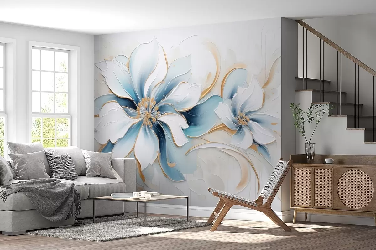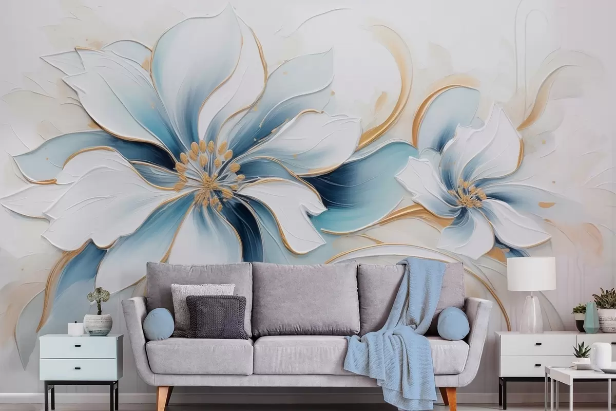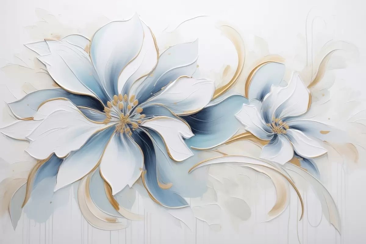 Painterly abstraction with blue flowers in oil painting style - Wall mural (No. w09524)