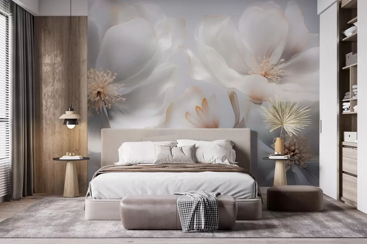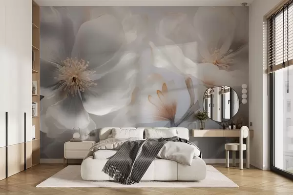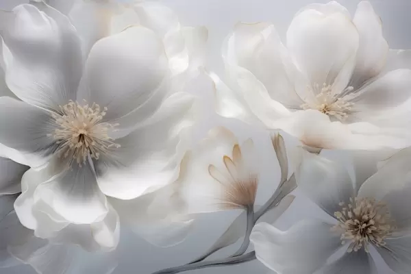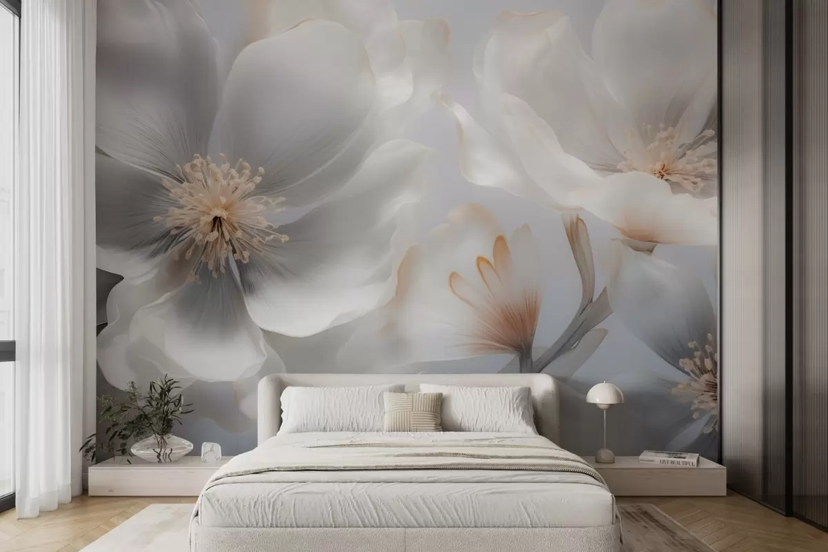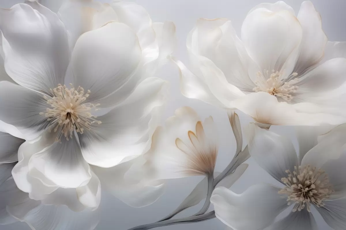 Pearlescent flowers in beige-gray and milky-cream hues - Wall mural (No. w09527)