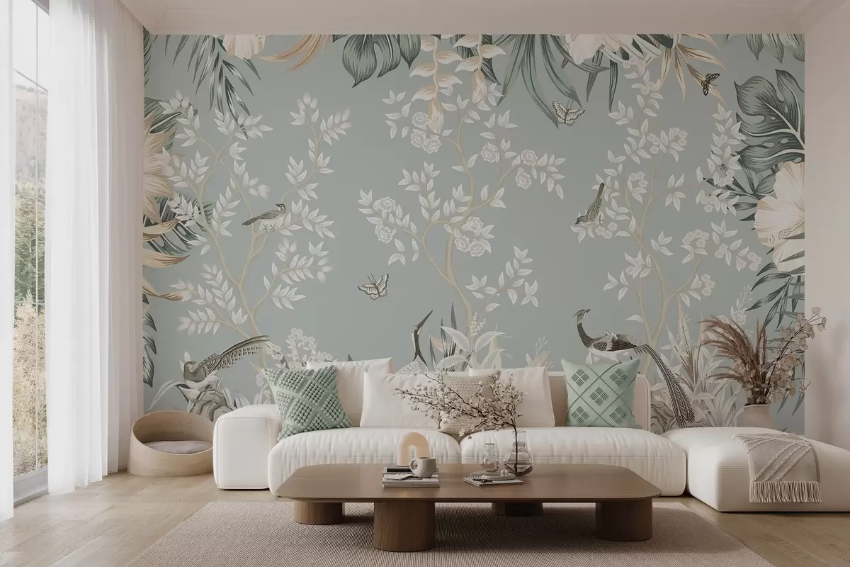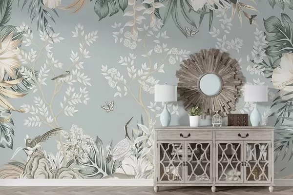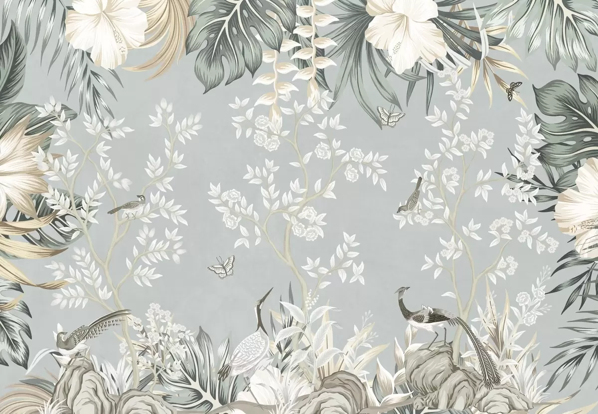 Tropical textured pastel art with birds, butterflies, hibiscus flowers, palm leaves and trees in a light blue background - Wall mural (No. w09528)
