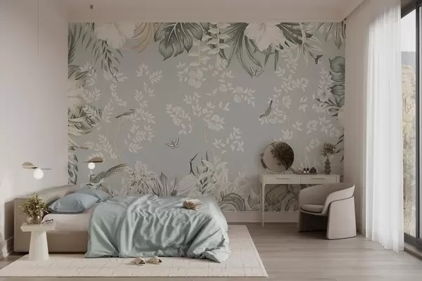 Tropical textured pastel art with birds, butterflies, hibiscus flowers, palm leaves and trees in a light blue background - Wall mural (No. w09528)