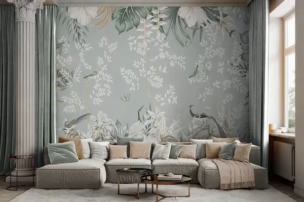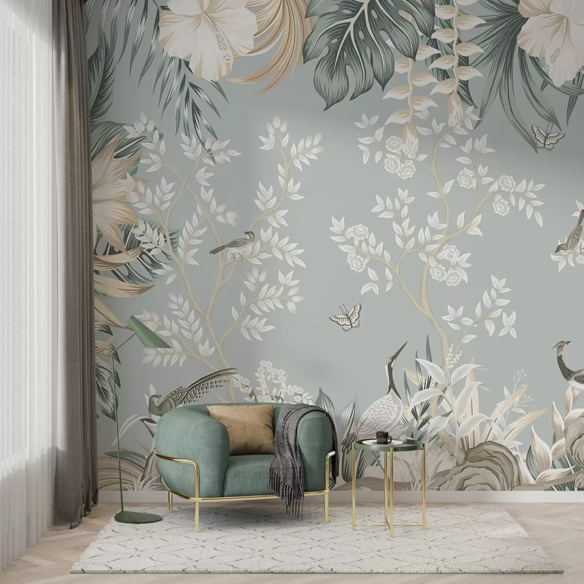 Tropical textured pastel art with birds, butterflies, hibiscus flowers, palm leaves and trees in a light blue background - Wall mural (No. w09528)