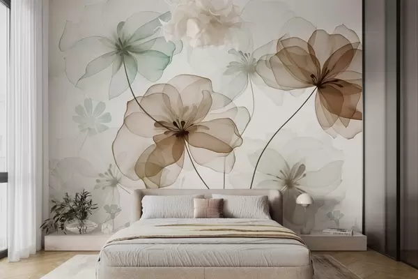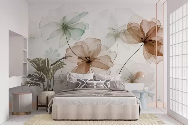 Translucent flowers with brown and green petals, long stems, light background, soft colors, textured floral design - Wall mural (No. w09529)