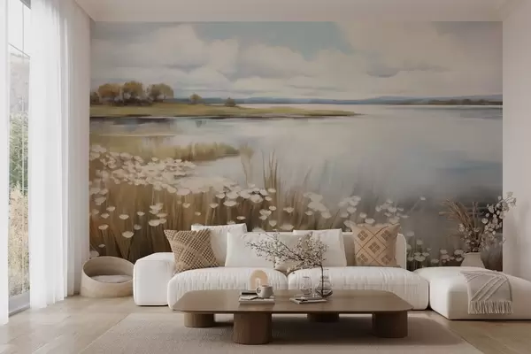 Textured landscape, field of white flowers and tall grass, a lake in the background, a grassy hill with trees, soft colors - Wall mural (No. w09530)