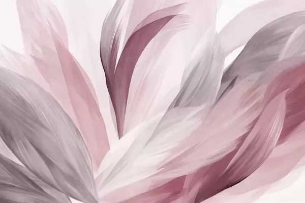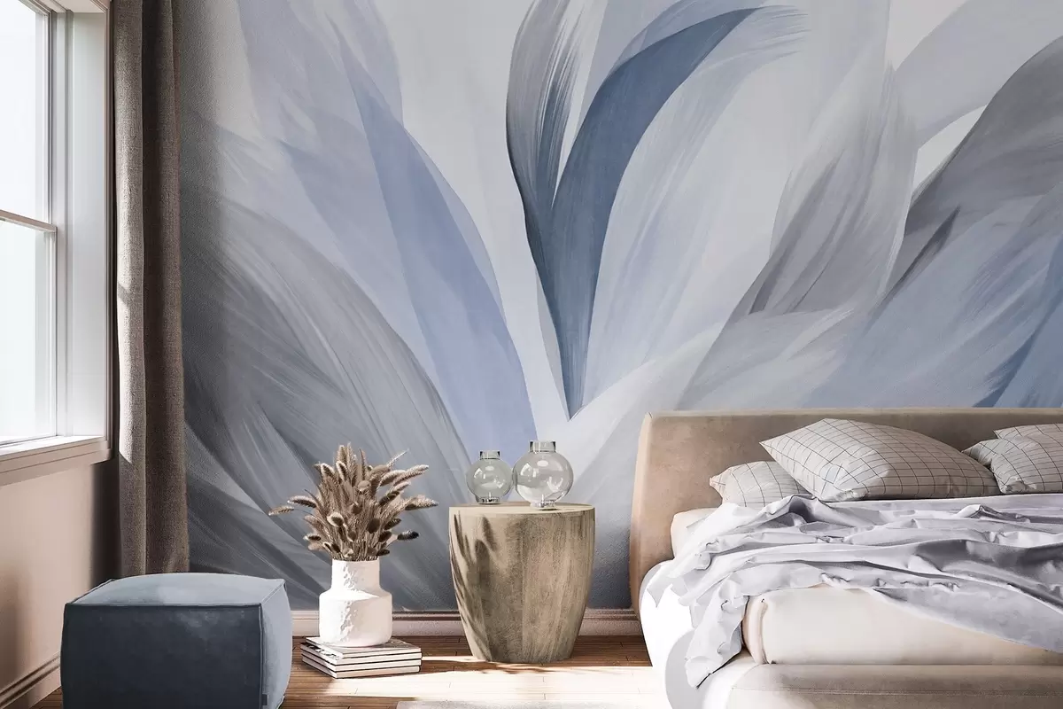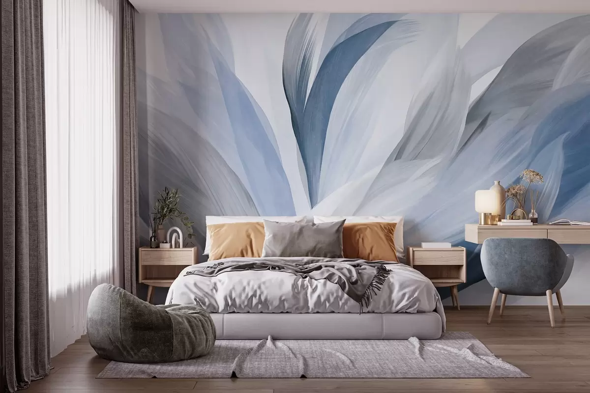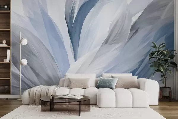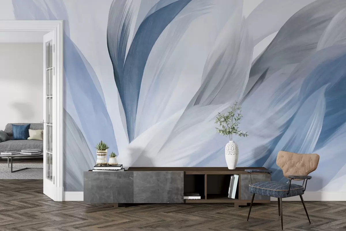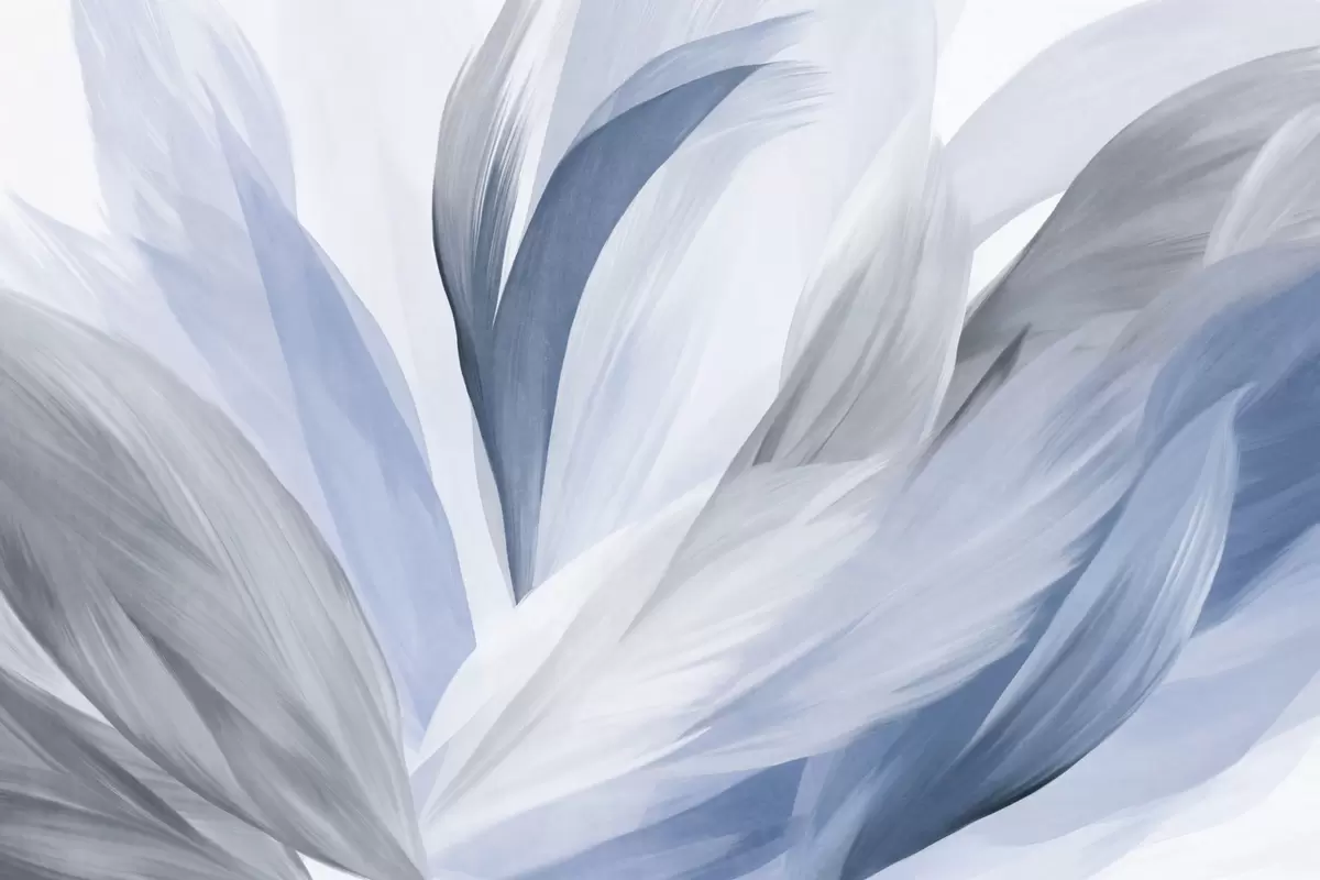 Abstract textured feathers in blue, white, and gray and various shades, overlapping on a white background - Wall mural (No. w09531v1)