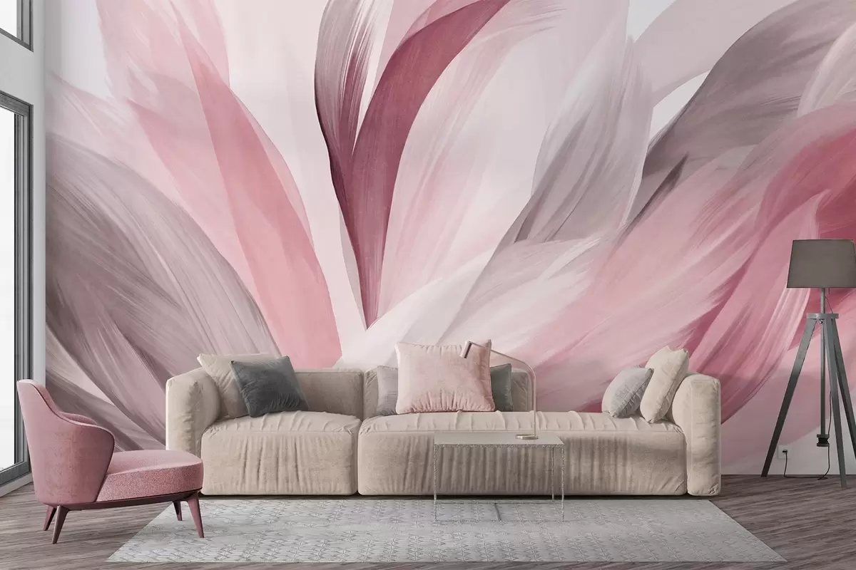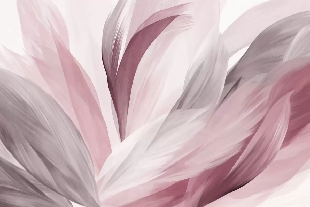 Abstract textured feathers in pink, white, and gray and various shades, overlapping on a white background - Wall mural (No. w09531v2)