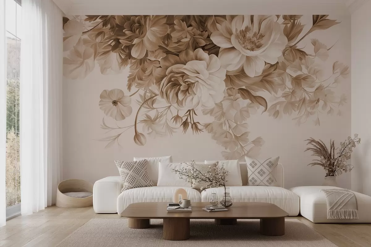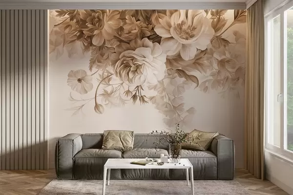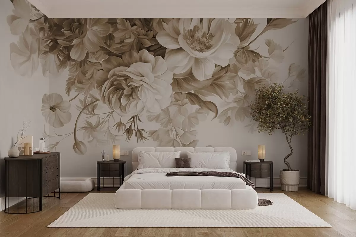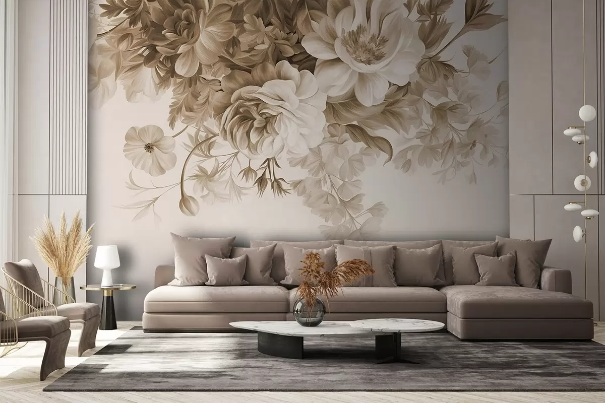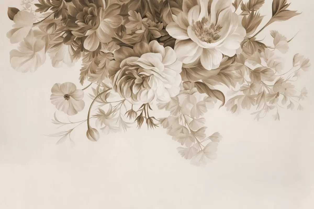 Vintage floral arrangement with roses, peonies and other textured flowers with foliage, on a light background - Wall mural (No. w09532v1)
