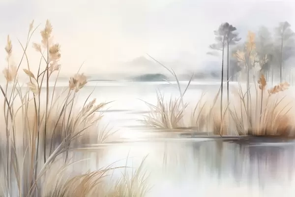Landscape with a lake and tall grass in the foreground, mountains in the background, soft colors, textured - Wall mural (No. w09534)