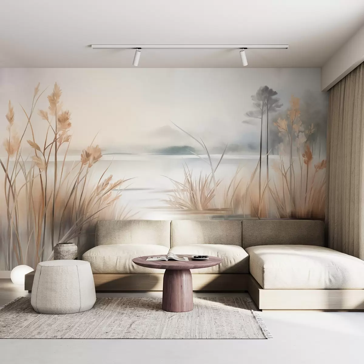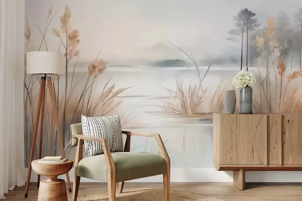 Landscape with a lake and tall grass in the foreground, mountains in the background, soft colors, textured - Wall mural (No. w09534)